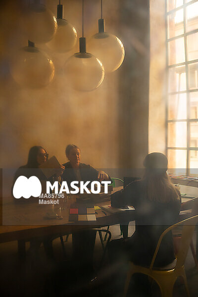 Kvinnliga entreprenörer sittande i konferensrum på kontor sett genom glas