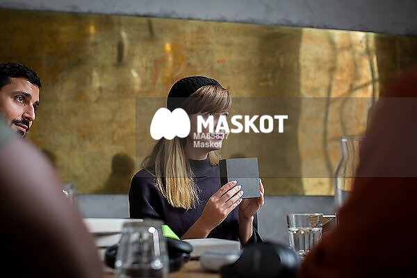 Leende kvinnlig entreprenör sitter i möte med kollegor på kreativt kontor