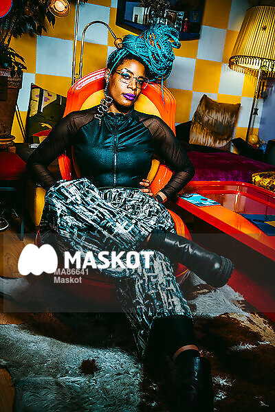 Porträtt av självsäker kvinna sittande i fåtölj i vardagsrum