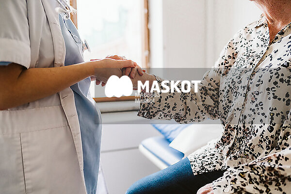 Kvinnlig läkare håller äldre patients hand i undersökningsrum