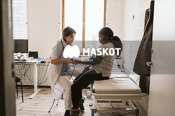 Läkare tar puls på ung kvinnlig patient i undersökningsrum