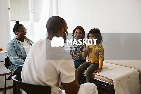 Leende syskon sitter på brits och lyssnar på läkare i undersökningsrum