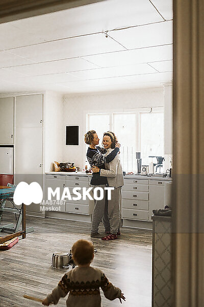 Kärleksfullt par står och tittar på dotter som leker i kök