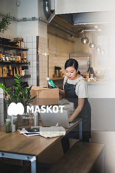 Kvinnlig ägare med förkläde arbetar på laptop stående i butik