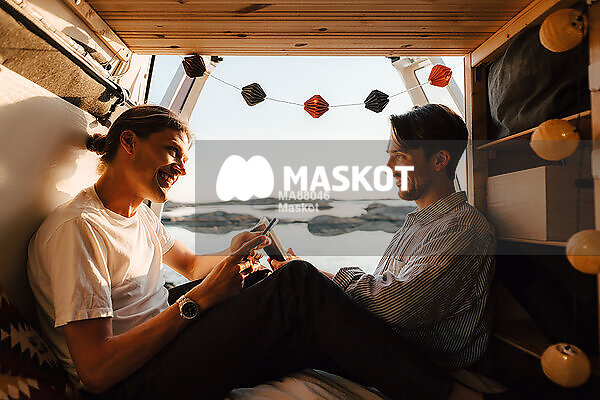 Par sitter i campingbuss vid strand och läser
