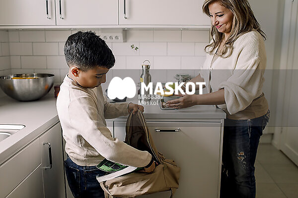 Leende kvinna hjälper son packa väska i kök