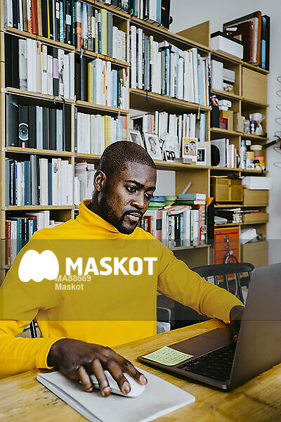 Fokuserad affärsman arbetar på laptop sittande hemma