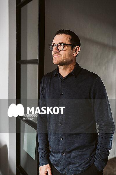 Fundersam man står i dörröppning och tittar bort