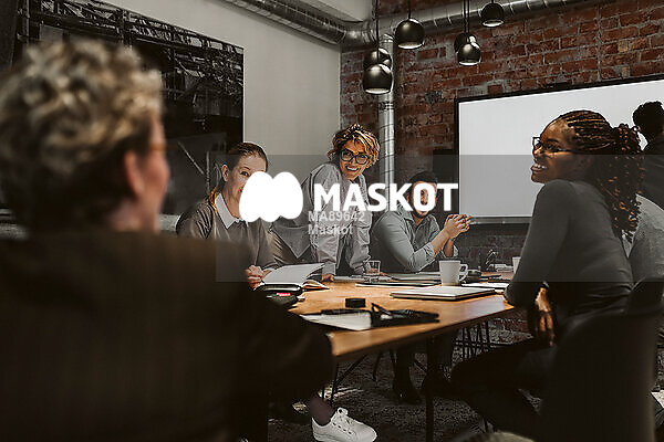 Leende grupp kollegor lyssnar under möte i konferensrum