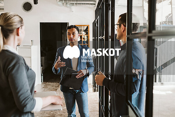 Entreprenör diskuterar med två kollegor i korridor på kontor