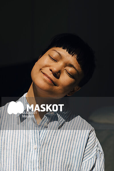 Leende kvinna sitter med slutna ögon hemma
