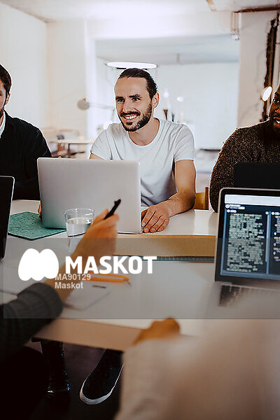 Leende manlig programmare sitter på möte med kollegor