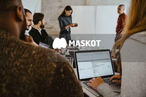 Kvinnlig programmare arbetar på laptop under möte på kontor