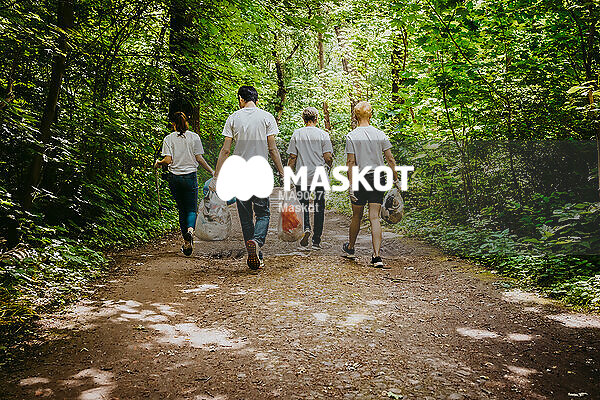 Kvinnliga och manliga volontärer går i park under skräpplockning