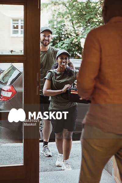 Leende teknikers hälsar på manlig kund stående i dörröppning