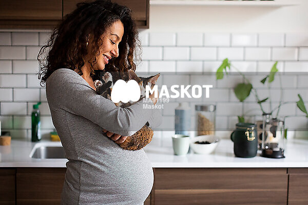 Glad gravid kvinna bär katt i famn stående i kök