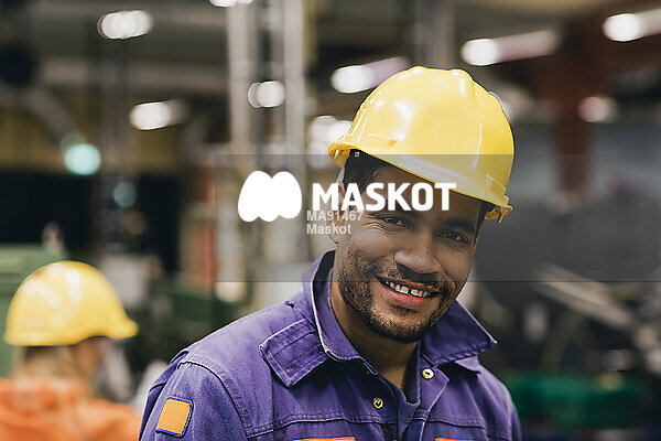 Porträtt av glad manlig arbetare med skyddshjälm