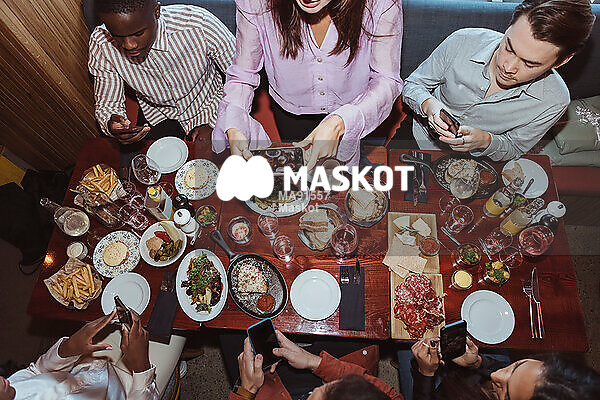 Vänner fotograferar mat med smartphone på resturang