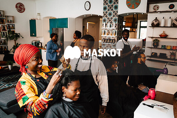Leende frisörska pratar med manlig kollega på frisörsalong
