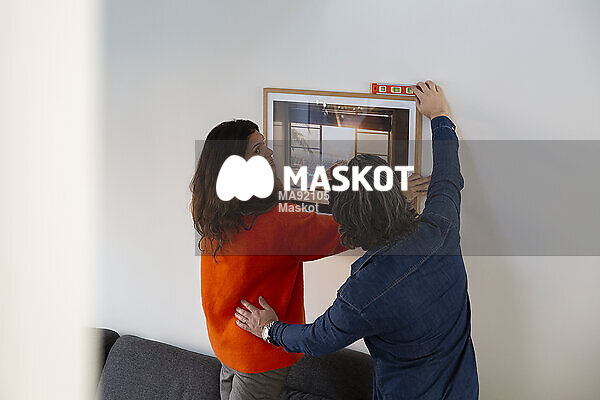 Man hjälper kvinnlig partner hänga upp tavla på vägg