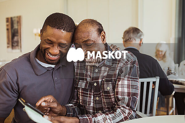 Leende äldre man visar mobiltelefon för vårdpersonal