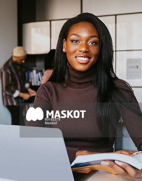 Porträtt av självsäker kvinnlig student som sitter i skola