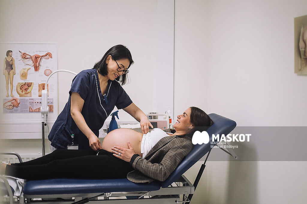 Glad gravid kvinna ligger på brits och blir undersökt av läkare