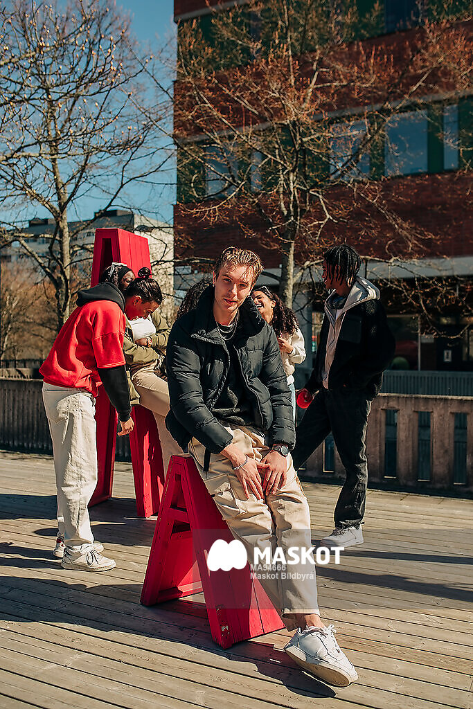 Porträtt av tonårskille som sitter med vänner i park