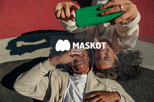 Leende tonårstjej tar selfie med killkompis