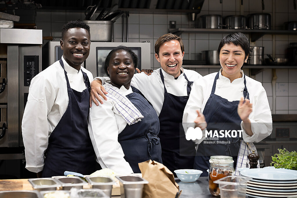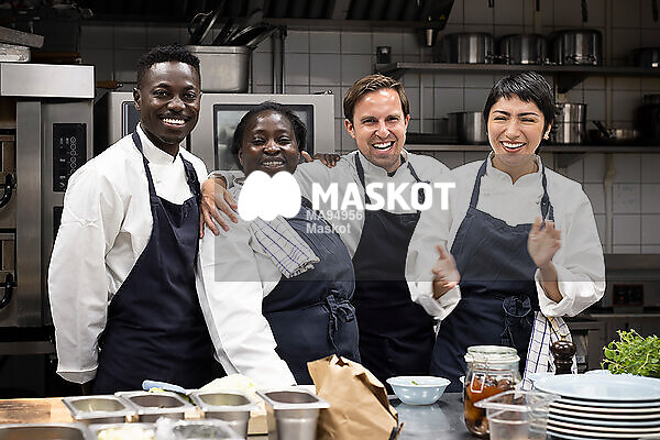 Porträtt av glada kockar ståendes i kök på restaurang