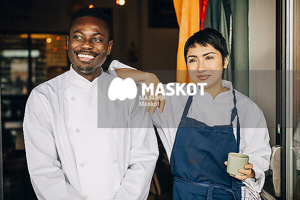 Glad manlig och kvinnlig kock kollar ut från restaurang