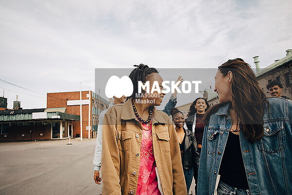 Leende unga tjejer går tillsammans med kompisar på gata med i stad