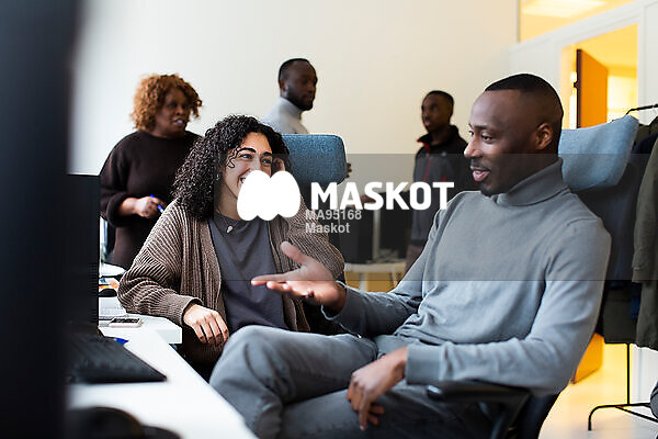 Affärsman diskuterar med glad kvinnlig kollega sittande vid skrivbord på kontor