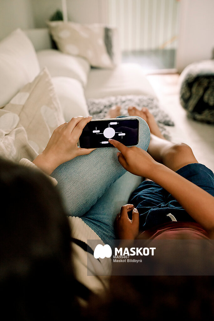 Mamma och son ligger i soffa tittande på mobiltelefon och använder app för smarta hem