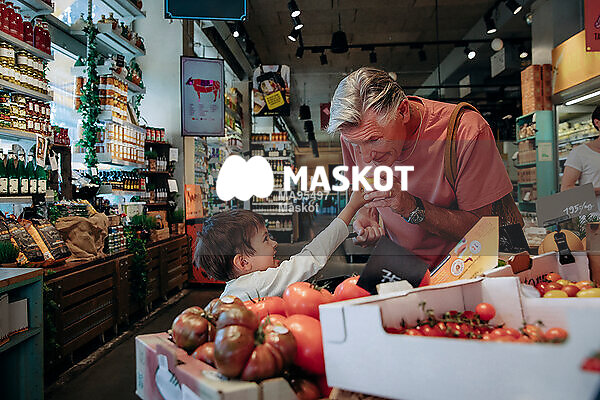 Äldre man handlar i mataffär med barnbarn