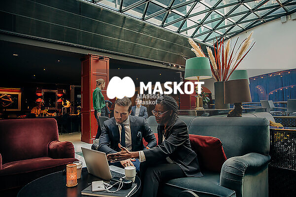 Affärskvinna förklarar på dator för manlig kollega sittande i hotellounge
