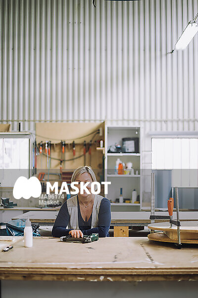 Porträtt av leende kvinna sittande vid arbetsbord på lager