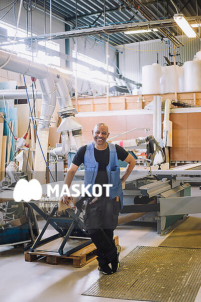 Porträtt av leende arbetsman stående lutad mot arbetsbord