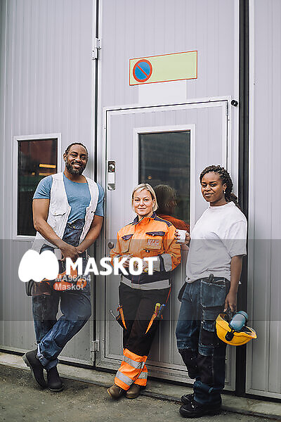 Porträtt av leende kollegor i arbetskläder stående utanför lagerlokal
