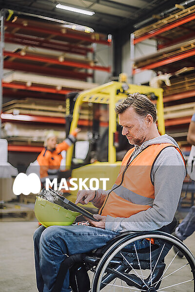 Fundersam man använder surfplatta sittande i rullstol på lager