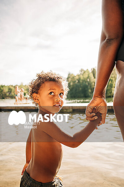 Pojke med bar överkropp håller mammas hand och kollar bakåt