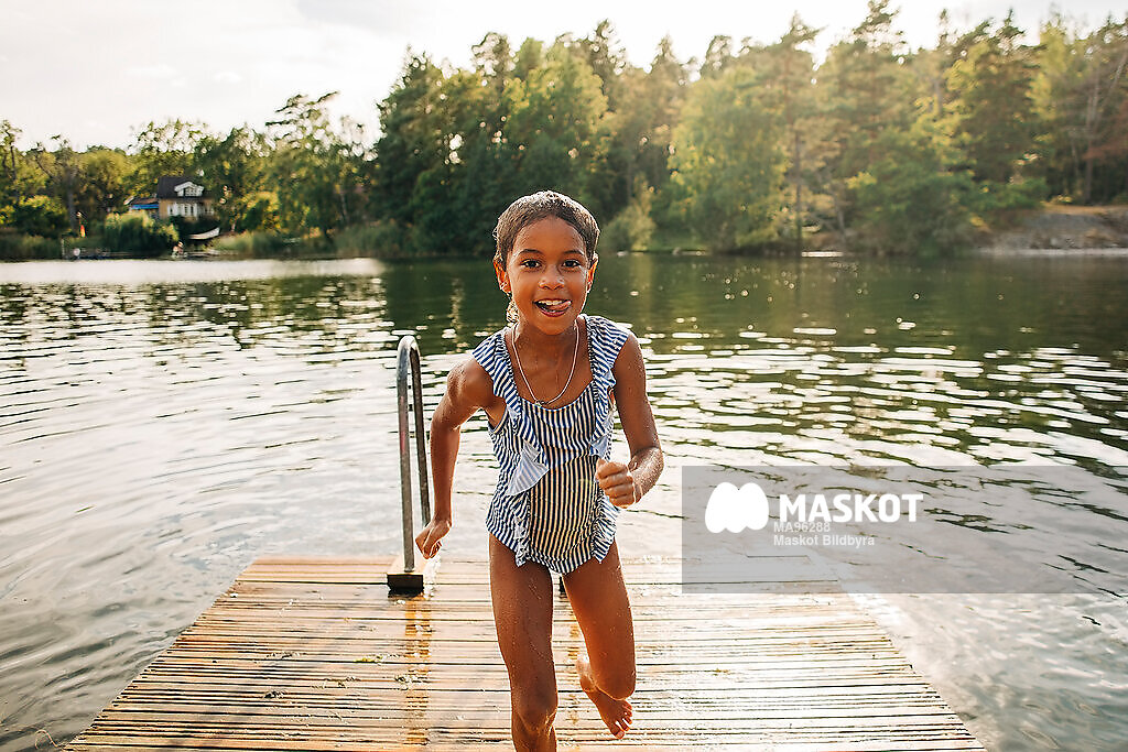 Porträtt av exalterad tjej springande på brygga vid sjö