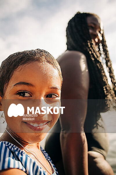 Leende flicka tittar bort stående bredvid mamma en solig dag