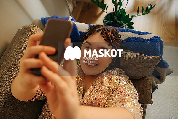 Glad kvinna tar bild på sig med smartphone liggande i soffa