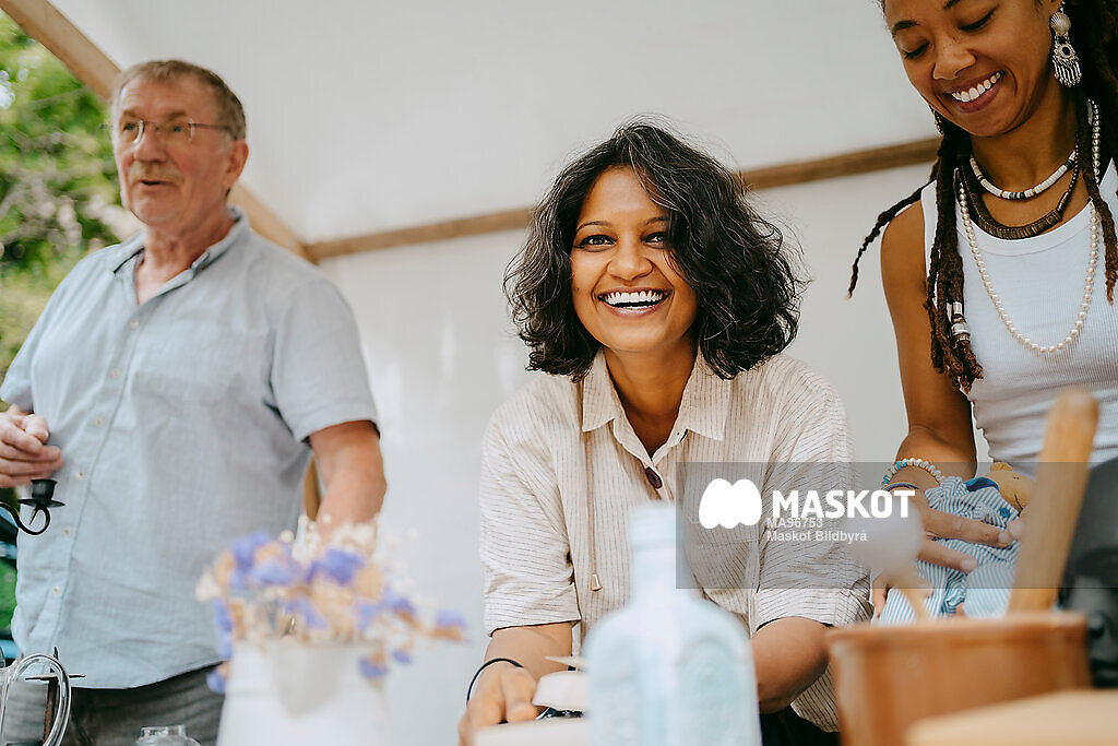 Porträtt av glad kvinna stående i stånd på loppmarknad