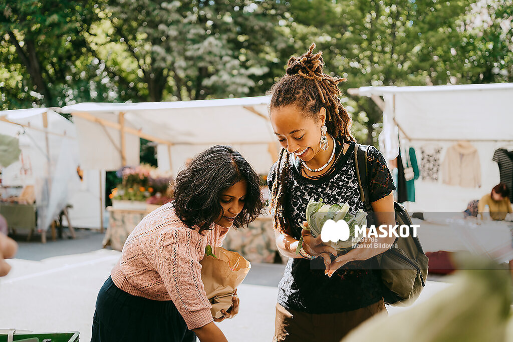 Glada kvinnor handlar grönsaker på marknad