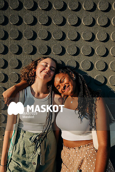 Glada tjejkompisar står lutade mot vägg och njuter av solen