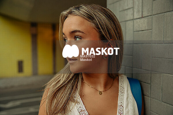 Tonårstjej står lutad mot vägg och tittar bort