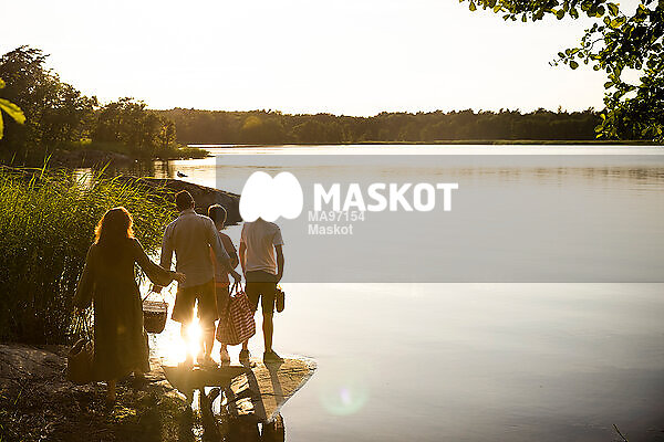 Familj med picknickkorg står vid vattnet och tittar ut