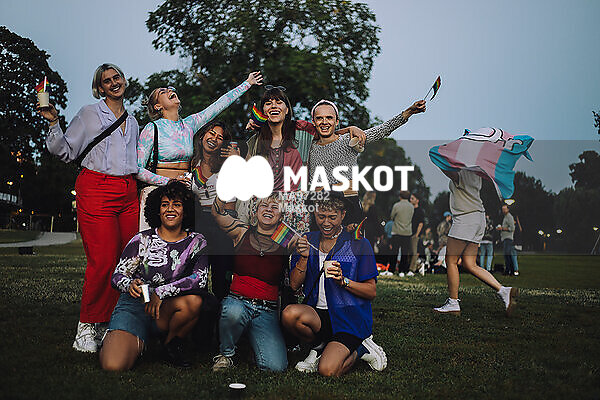 Porträtt av glada vänner med flaggor i park